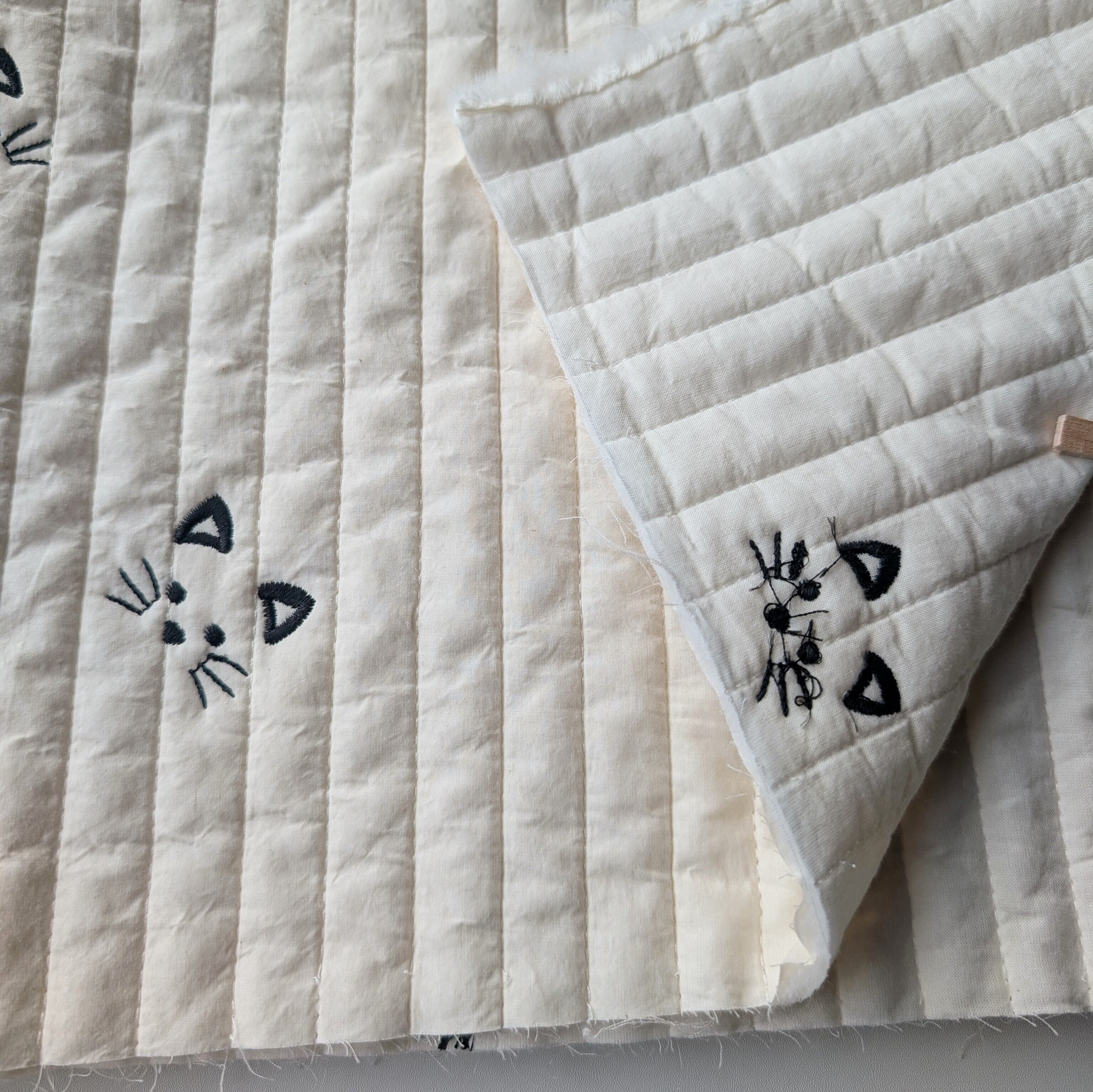 ちょこんと並ぶ猫の顔刺繍が愛らしいヌビキルティング生地です。