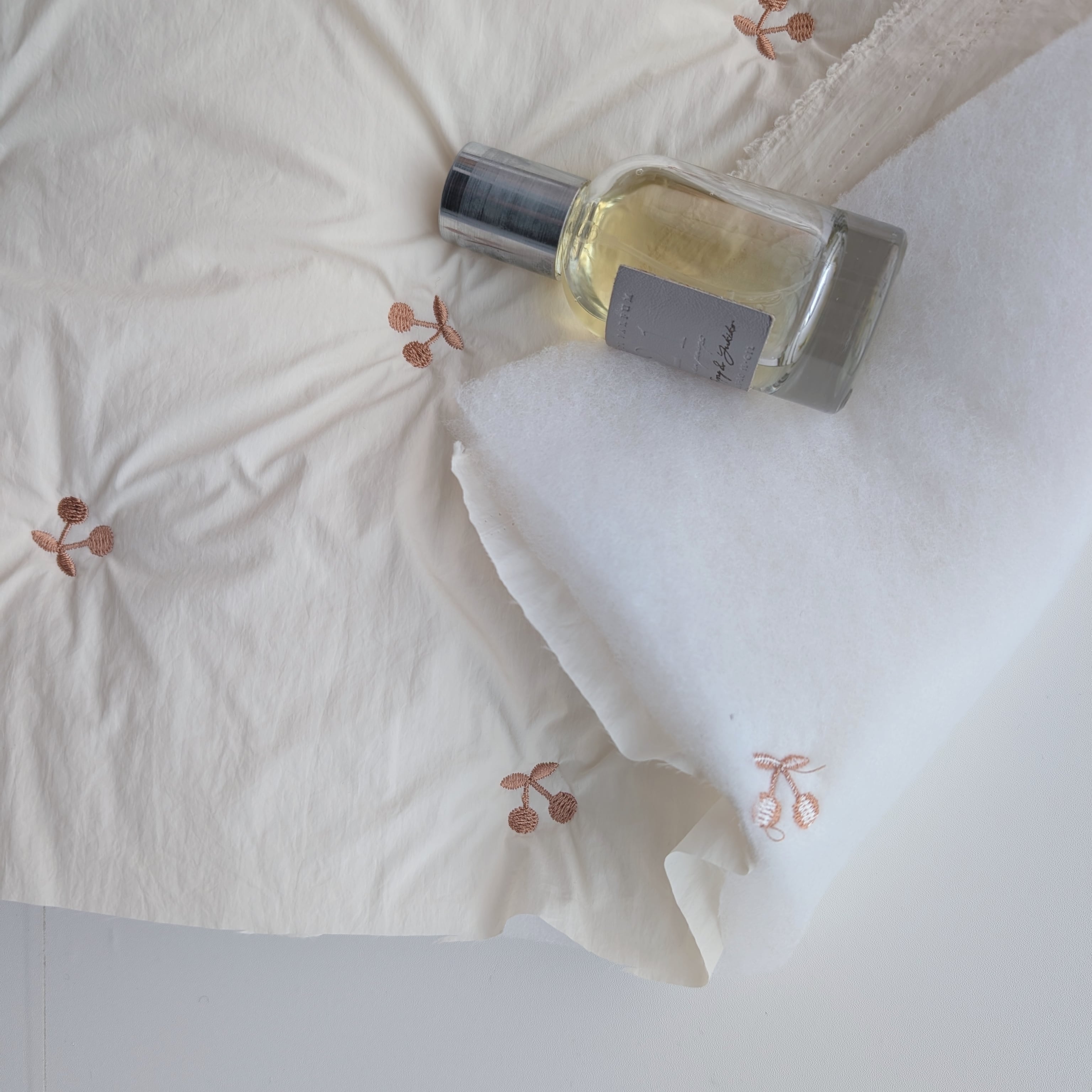 小さなチェリー刺繍が散りばめられたキルティング生地。